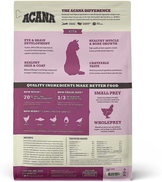- The ACANA First Feast recipe is made in the USA with small-prey ingredients and liver for a purr-worthy taste.