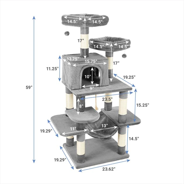 - This cat tree has all your kitty’s needs covered by providing cozy spots to relax in, hideouts to retreat to at their leisure, scratching and perching opportunities, and playtime fun.