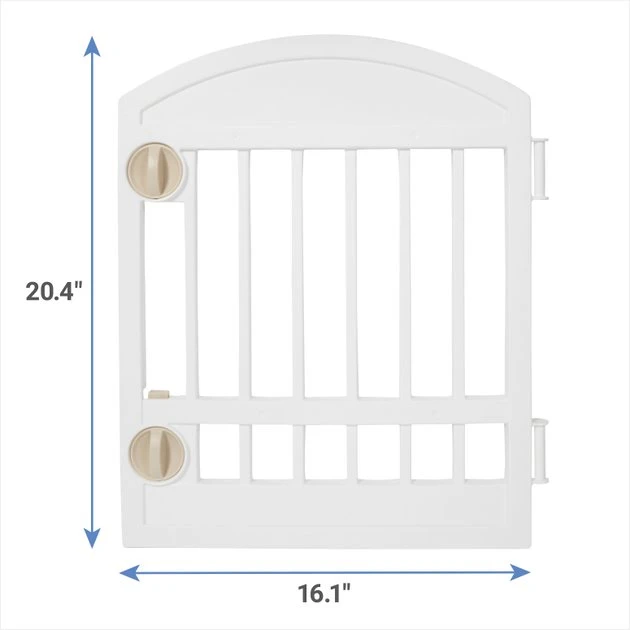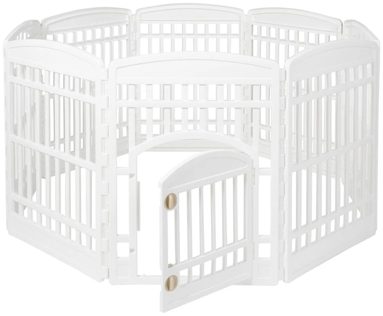 Give your furry friend a safe and secure place to play and lounge with a spacious pen from Frisco! This exercise pen safely keeps your pet enclosed in any indoor area you choose, so they can stretch out in the 18 square feet of play space while you relax knowing your best pal is comfortable and out of trouble. The eight individual panels have an interlocking design that snaps together easily with no added parts, and the secure, double-latch door requires no extra assembly time. Just snap the panels together and relax! This pen has a configurable design, so you can adjust the shape of the enclosure to hold their food and water bowls, plenty of toys and even a comfy bed. Plus, to protect your floors from scratches and scuffs, the panels have non-skid rubber feet that keep the pen in place.