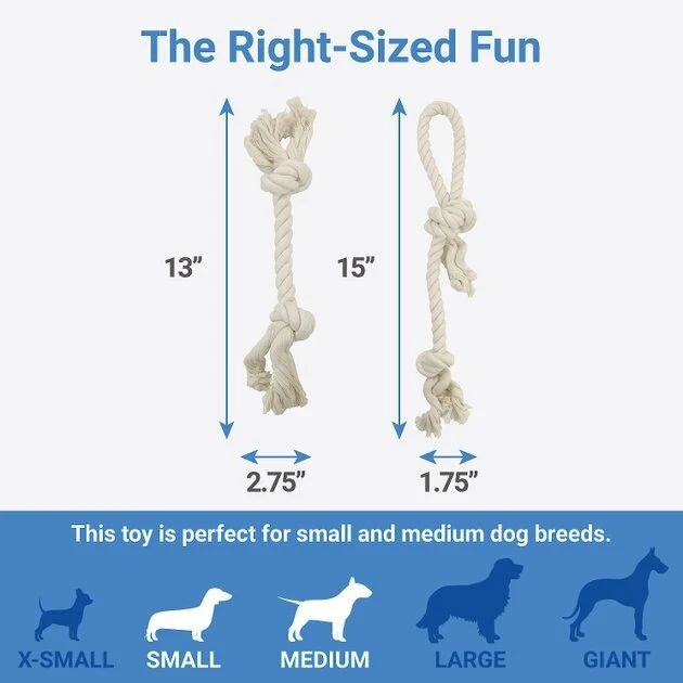 Cotton rope toys—these are old school doggie favorites! Try out this two-pack for your pup and keep playtime simple. With 100% cotton rope and two different, knotted designs, you’re sure to find a way to play. One rope has simple, knotted ends your dog will love to chomp on, while the other features a handle on one end for you to grab onto and a knot on the other. Plus, these toys are sized perfectly for small to medium dog breeds so your pup can get in the game, no matter their size.