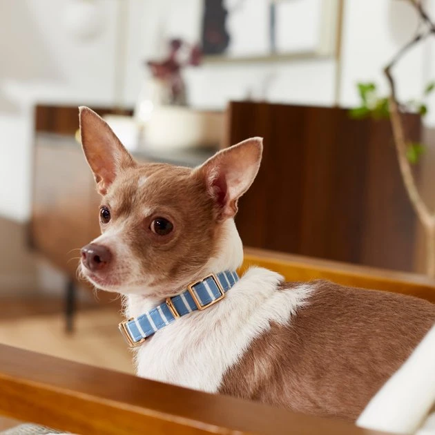 Upgrade your pup’s daily walks with a collar that combines function with a fashion-forward print. Made with nylon webbing and curved buckle for comfort, it’s the go-to collar for all your walks, jaunts and strolls. Available in various sizes to suit most dog breeds. Plus, most sizes have a handy D-ring to attach an ID tag without cluttering the leash ring.