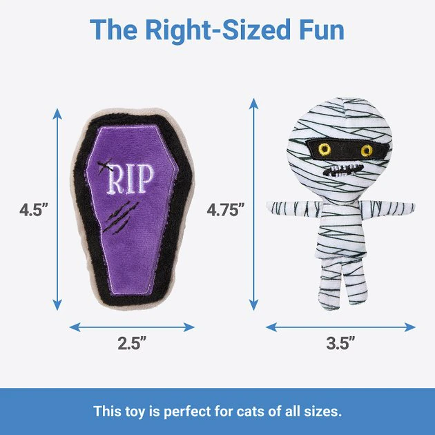 Give your kitty a Halloween treat with this duo of classic, spooky toys to get them in the spirit! This two-pack includes a coffin toy and an adorable mummy that team up to bring your cat twice the fun when it’s time to play. They’re covered with claw-friendly fabric, plush-stuffed and infused with exciting catnip to make play seem irresistible. With this terrific twosome, your cat will be on the prowl for fun all through the Halloween season.