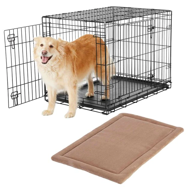 Remember to measure your pet for the paw-fect fit. Each purchase comes with the Frisco Heavy Duty Fold & Carry Double Door Collapsible Wire Dog Crate and the Taupe Frisco Micro Terry Dog Crate Mat. Paw-fect for training or keeping him safely contained while you’re away, this crate is larger with thicker and heavier wiring than standard Frisco crates for added security. Each panel is constructed with rounded corners for your pet’s safety. The two large doors—one at the front and one on the side—give you more placement options in the home, and they make exit and entry a breeze in the car. The mat is a cozy addition to your furry buddy’s new crate. It’s made with a cushioned, poly-cotton base for a layer of comfort, and the micro-terry top keeps him cool in the summer and toasty in the winter.