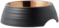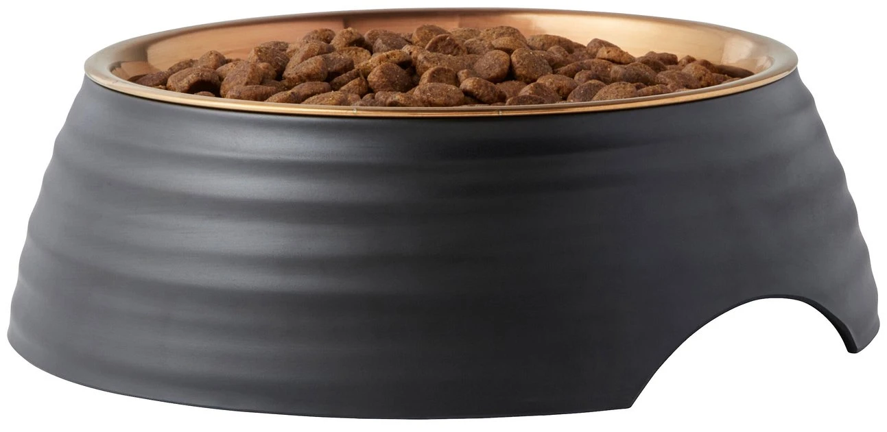 For a distinguished look, this bowl is the top of the line. It includes a removable light copper-colored stainless steel bowl that easily comes out of the matte black melamine base when it’s time to give your dog’s dinnerware a wash. The base has an elegant design that looks great in your home and helps keep their bowl in place to cut down on doggie dinner messes. Available in three sizes, you’re sure to find a bowl that fits your dog’s appetite and your home décor.
