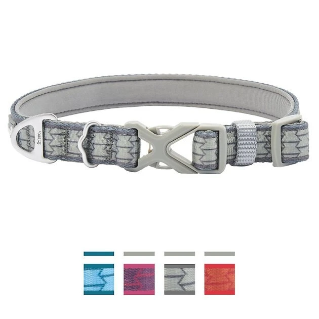 Explore the great outdoors with this Frisco Outdoor Comfort Print Nylon Padded Collar, Large, Neck: 18 -26-in, Width: 1-in + Outdoor Ultra Reflective Rope Leash With Padded Handle, Stone Gray, 6 – ft bundle! The collar features a printed, brick-like design and is padded on the inside to ensure comfort and help reduce irritation from rubbing. It’s paw-fect for the outdoorsy pup in your life, with improved features designed just for the trail, like a D-ring and a separate tag ring, too. Attach the included leash using the lobster clip. This leash is just like a classic rope leash with durable, secure nylon rope with ultra-reflective accents to increase your dog’s low-light visibility. That means safer dusk and nighttime walks. The loop handle has extra padding, so it feels great wrapped around your wrist or in your hand. This bundle is grrr-eat for all your outdoor ex-paw-ditions!