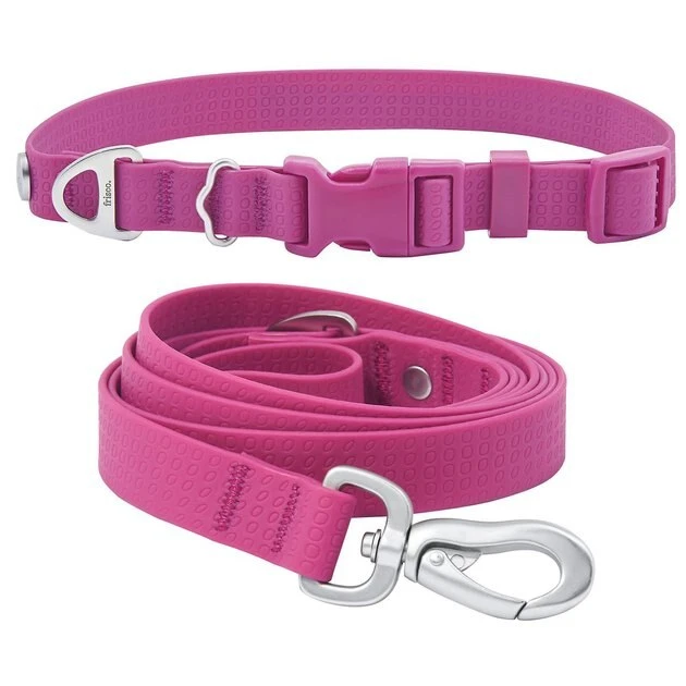 Outdoorsy dog parents know the tell-tale smell of a stinky collar and leash! Leave that funk behind with the Frisco Outdoor Solid Textured Waterproof Stink Proof PVC Collar, Boysenberry Purple, Small – Neck: 10½14-in, Width: 5/8-in + Dog Leash, Boysenberry Purple, Small – Length: 6-ft, Width: 5/8-in bundle! Both the collar and leash are made with durable polyester webbing and finished with matte PVC coating that resists water and odor-causing bacteria, so they are perfect for dogs who love water and tend to get a little dirty while enjoying their outside time. The collar features a D-ring for secure leash attachment and a separate tag ring too, while the leash features a secure lobster clasp and a D-ring so you can attach waste bags!