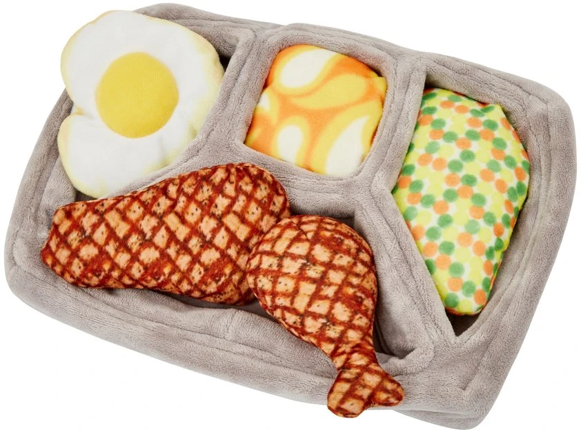- TV dinner puzzle toy features five individual pieces for pups to play with.