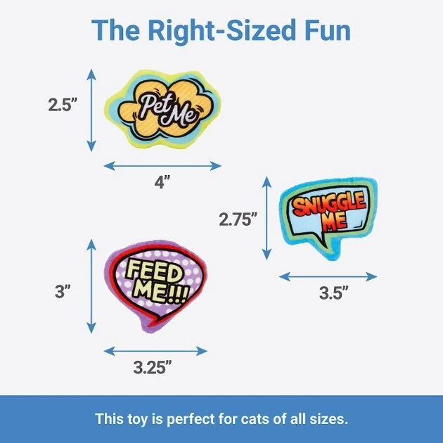 Bang! Whoosh! These comic book bubble cat toys send your cat zooming into a frenzy of retro fun like no other toy can. This three-pack of comic-themed toys each has a plush, clawable fabric cover with enticing, exciting catnip stuffed inside that will drive your cat wild during playtime. Add some retro, flashback flair to your furball’s toy collection with these toys from Frisco!