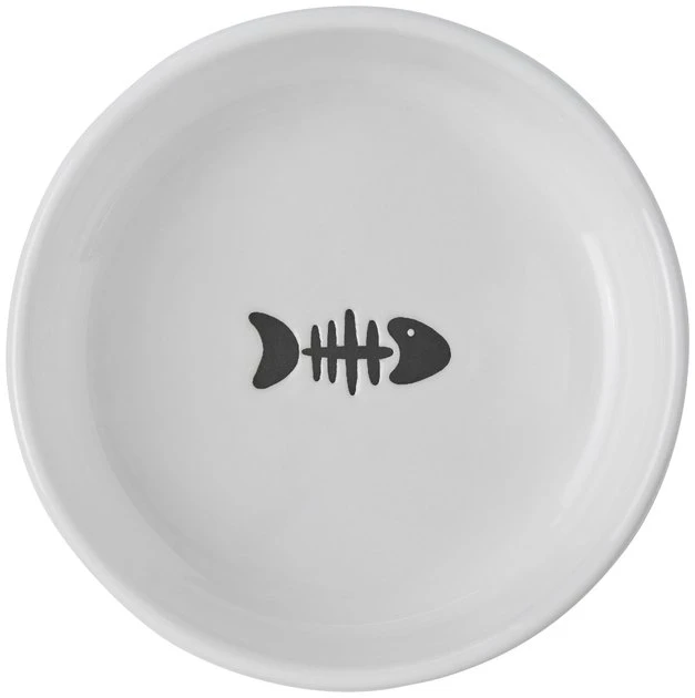 - Round, white ceramic pet bowl with a cute “meow” graphic on the side.
