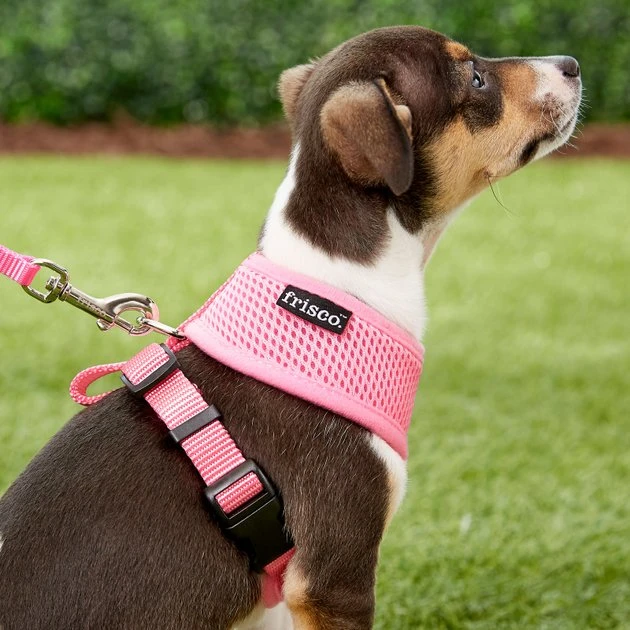Remember to measure your pet for the paw-fect fit. The Frisco Soft Mesh Dog Harness provides pet parents with a soft, easy-to-use harness. Made with breathable mesh material, this harness will help your pet stay comfy and cool while out on their everyday walks. The over-the-head design and fast-release buckle make it easy to get on and off, while the adjustable slide on the belly strap ensures that you get the perfect fit to keep your pup secure. The D-ring at the back of the harness is secured using durable nylon fabric for you to attach your leash to, so you will always feel in control. This soft mesh dog harness comes in sizes from small to extra-large, and in four different colors—pink, red, blue and black—so you can choose the one that best suits your pup and their style.