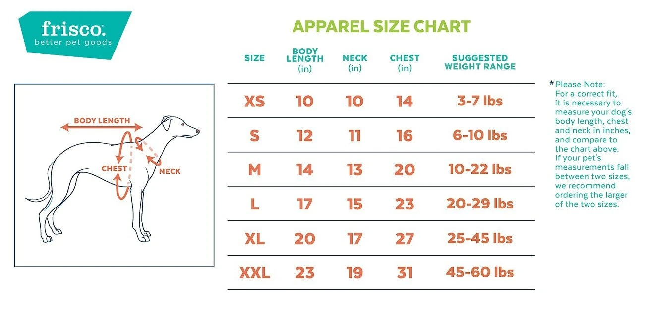 | Size | Body Length | Neck | Chest | Suggested Weight Range |