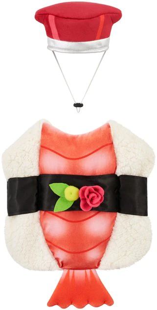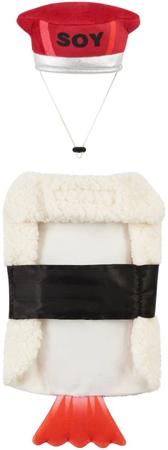 This Halloween, your pet will look like a snack in the Frisco Sushi Dog & Cat Costume! This two-piece costume includes a sushi body with white sherpa fabric and wasabi and flower accents, so it looks like the real deal. With hook-and-loop fasteners at the neck and belly, it fits comfortably and goes on easily, so there’s less fuss when it’s time to dress up. The separate soy sauce hat is not only adorable, it’s comfy, too, with adjustable elastic ear and chin straps. Head out for a party, trot around the neighborhood for tricks or treats, or stay home for a furry photo op in this costume and make Halloween a hit!