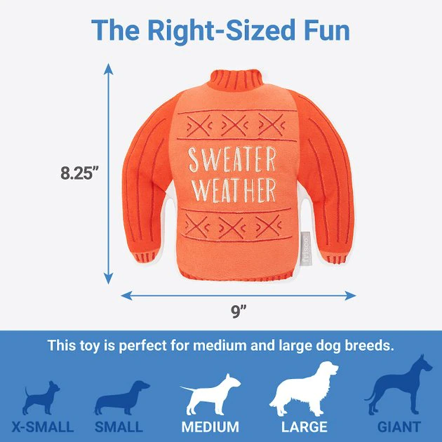 When that tell-tale fall chill blows through, you and your pup know it’s sweater weather. This is the perfect toy for this time of year! With a soft cover, plush stuffing and four squeakers inside, it’s not only perfect for playtime but it’s snuggly enough to be your medium or large pup’s favorite nap buddy too.
