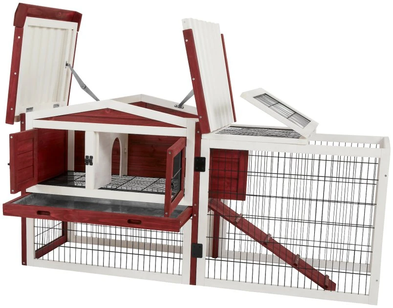 Give your rabbit a home that’ll put a little extra hop in those furry feet! Not only is this hutch suitable for rabbits, but it works for any small animal that you just so happen to call a friend. Made from high-quality solid wood, with a red finish and white accents, your pet will never want to leave this cozy, comfortable abode. Not only is this hutch easy on the eyes, it’s also super functional with its PVC roof that’ll help keep your friend protected from the outside elements. The access ramp offers a convenient path inside and outside of the hutch, so watch those cute little feet hop and scamp around their new favorite hangout spot.