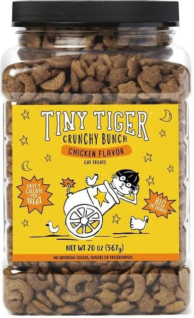 - Tiny Tiger Crunchy Bunch, Chicken Cannonball, Chicken Flavor Cat Treats are only 1 calorie per treat so you can make snack time part of a healthy, balanced diet.