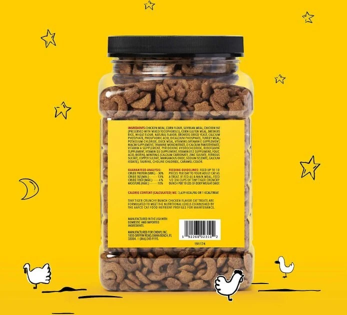 - Tiny Tiger Crunchy Bunch, Chicken Cannonball, Chicken Flavor Cat Treats pack a big crunch to scrub teeth and satisfy kitty’s cravings for crunchy snacks.